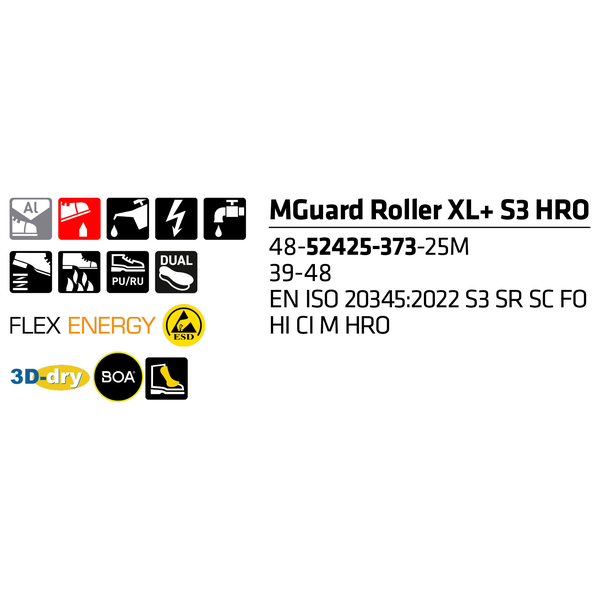 Der MGuard Roller wurde für anspruchsvolles Arbeitsumfeld entwickelt. Der integrierte Metatarsal Ristschutz dämpft auf den Spannbereich einwirkende Stöße um bis zu 90% ab. Die FlexEnergy®-Stoßdämpfung fängt mehr als 55% der kinetischen Energie auf und gibt sie an den Bewegungsapparat zurück. Die Sievi TractionPro®-Antirutschsohle garantiert maximalen Halt. Für zusätzlichen Komfort sorgen Dual Comfort-Einlegesohlen, BOA® Fit System-Verschluss und XL-Leisten.