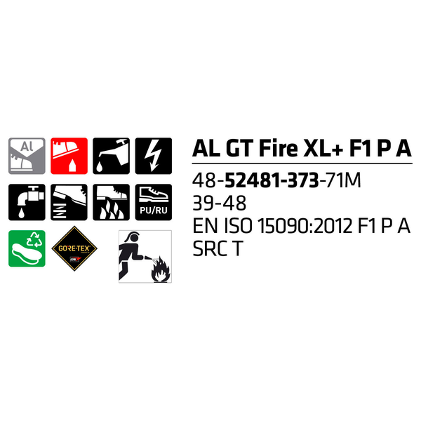 Der wasserdichte Feuerwehrstiefel AL GT Fire erfüllt die Anforderungen der Brandsicherheitsnorm F1PA. Seine Zehenschutzkappe ist aus Aluminium. Die neue Lamellen-Antirutschsohle gewährt optimalen Halt auf glattem Untergrund und ist hitzebeständig bis 300°C. Die FlexStep®-Zwischenschicht der Sohle schützt Fuß und Rückgrat vor Stößen und übermäßiger Beanspruchung. Seitliche Zuglaschen am Schaft erleichtern das Anziehen der Stiefel.