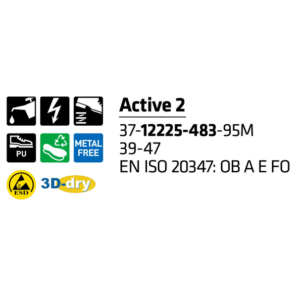 Das Obermaterial der ESD-zugelassenen Active-Modelle ist robuste, waschbare Mikrofaser. Das 3D-dry®-Futter leitet Feuchtigkeit effektiv von der Fußoberfläche in die Zwischenschicht des Futters und von dort aus durch das Obermaterial nach außen ab. Die anatomische, ganzflächige Sievi Comfort-Einlegesohle erhöht den Tragekomfort. Die neu gestaltete Sohle ist rutschfest, robust, und stoßdämpfend.