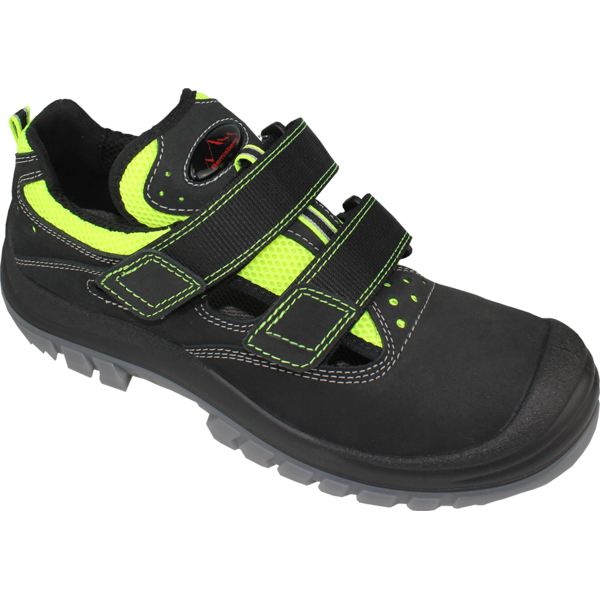 S1P Sicherheitssandale aus Rindleder im Nubuk-Look mit spezieller 2-Schichten PU-Laufsohle, 2-fach Klettverschluss, atmungsaktives Futter, selbstrückstellende Kunststoffkappe und Stahlzwischensohle