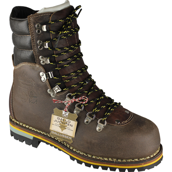 Forststiefel aus gefettetem und strapazierfähigem Schweizer Juchtenrindleder mit Lederbrandsohle, Doppelzunge und doppelte Schnürung, zwiegenäht, Volllederfütterung und weicher Schaftabschluss, Stahlkappe, für mittleres und schweres Gelände, Schnittschutz