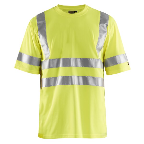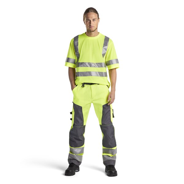 Bequemes fluoreszierendes High Vis T-Shirt mit Rundhalsausschnitt und kurzen Ärmeln. Der Stoff hat gute Atmungseigenschaften und das T-Shirt hat aufgenähte Reflexstreifen für eine gute Sichtbarkeit. Zertifiziert nach der Norm EN ISO 20471, Klasse 3, High Vis Schutzkleidung.