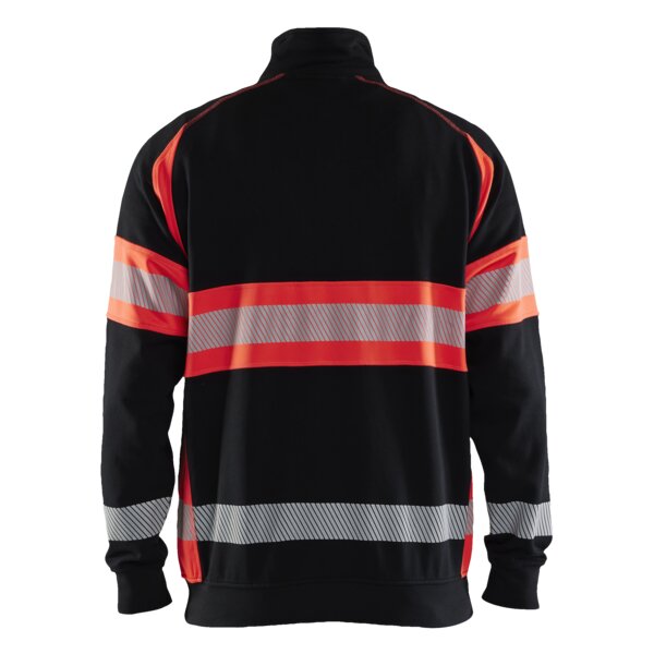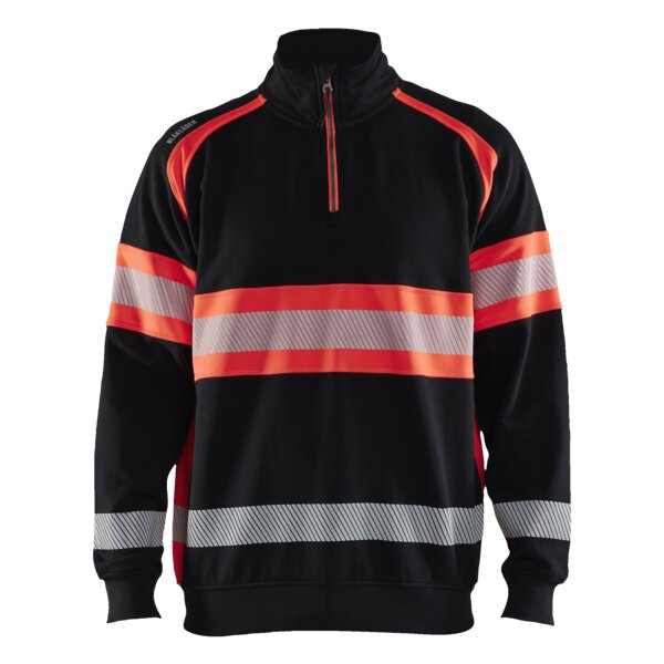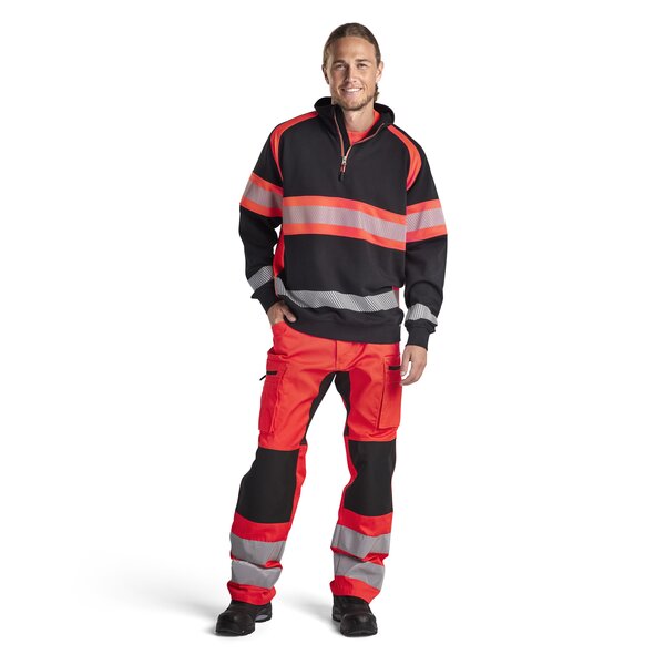Ein weicher und bequemer High Vis Sweater mit unterbrochenen Reflexstreifen für besonders gute Stretch-Fähigkeit und Atmungsaktivität. Er hat einen hohen Kragen, einen Half Zip-Reißverschluss und Bündchen an der Unterseite und den Ärmelenden für höheren Komfort. Der dunkle Teil des Sweaters besteht aus 100 Prozent Baumwolle und der High Vis-Teil ist aus 100 Prozent Polyester gefertigt. Zertifiziert nach EN ISO 20471, Klasse 1.