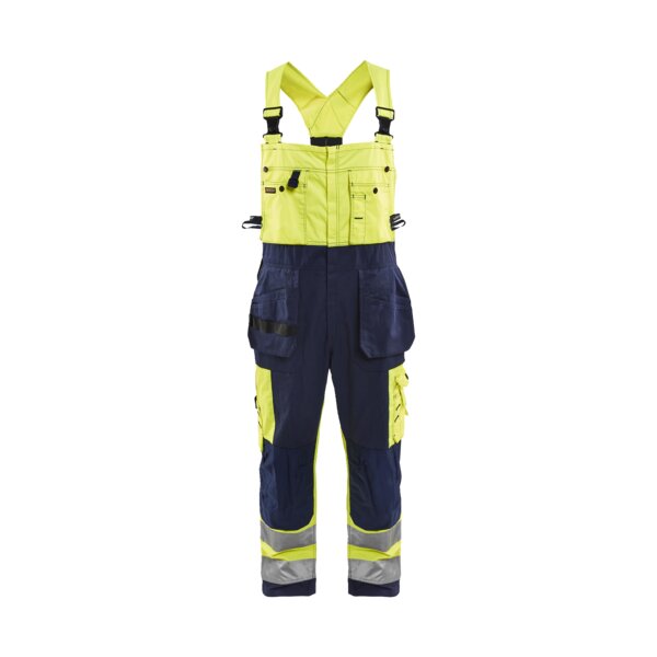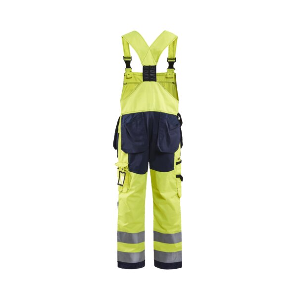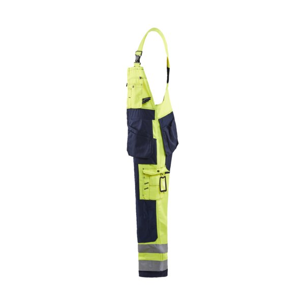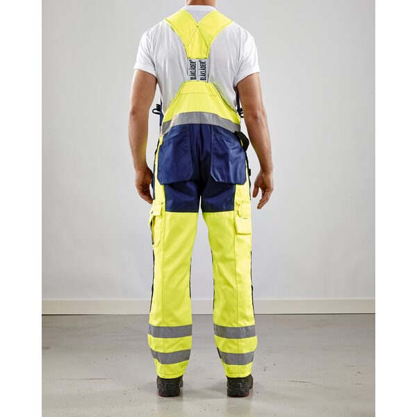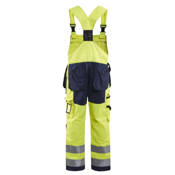Eine High Vis Latzhose mit CORDURA® verstärkten Knien und Gesäßtaschen für zusätzliche Haltbarkeit. Kniepolstertaschen mit Platzierung auf zwei Ebenen. Die Hose hat breite, starke elastische Hosenträger sowie intelligente Taschenlösungen und Funktionen wie einen Hammerhalter, eine Zollstocktasche mit Messer- und Stifttasche und einen D-Ring. Gesäßtaschen mit Balg und Nageltaschen, die in die Vordertaschen mit Balg passen.
