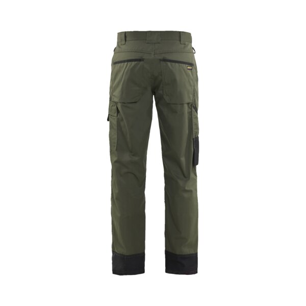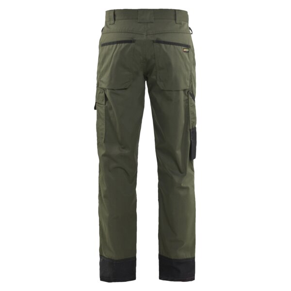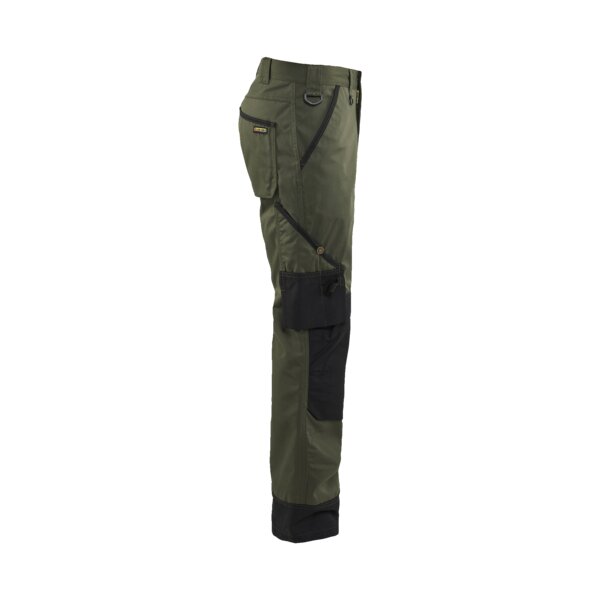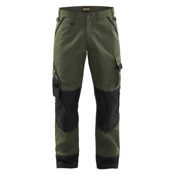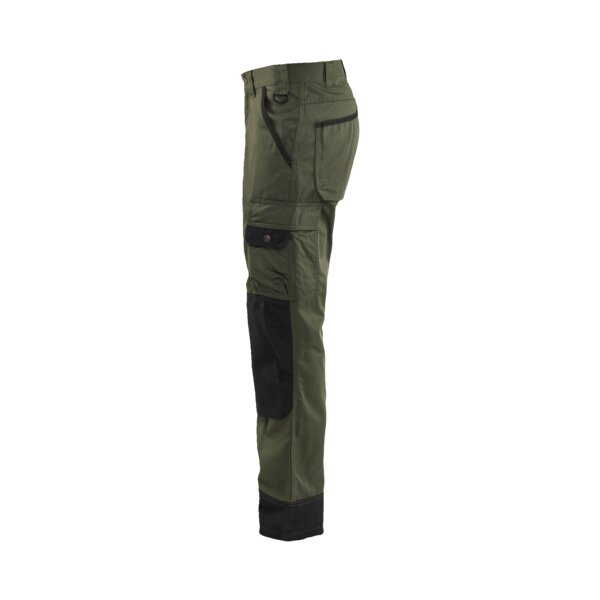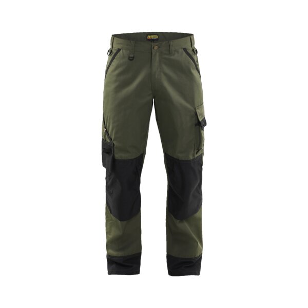 Garten Arbeitshose aus Recycling-Polyester und Baumwolle. Die Taschen der Hose sind an Werkzeuge wie Gartenschere, Handspaten, Zollstock sowie Block und Bleistift angepasst.