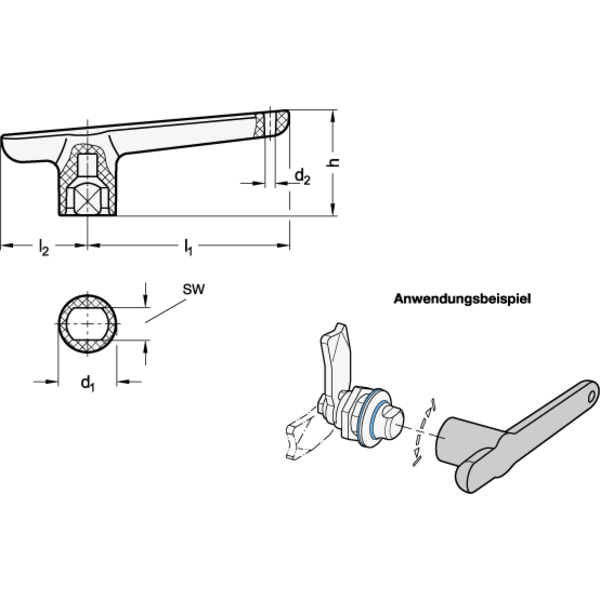 Die Bohrung d2 dient der Aufbewahrung der Steckschlüssel z. B. nahe dem Verwendungsort oder erlaubt das Anbringen eines Schlüsselrings oder Halteseils zur Verliersicherung.