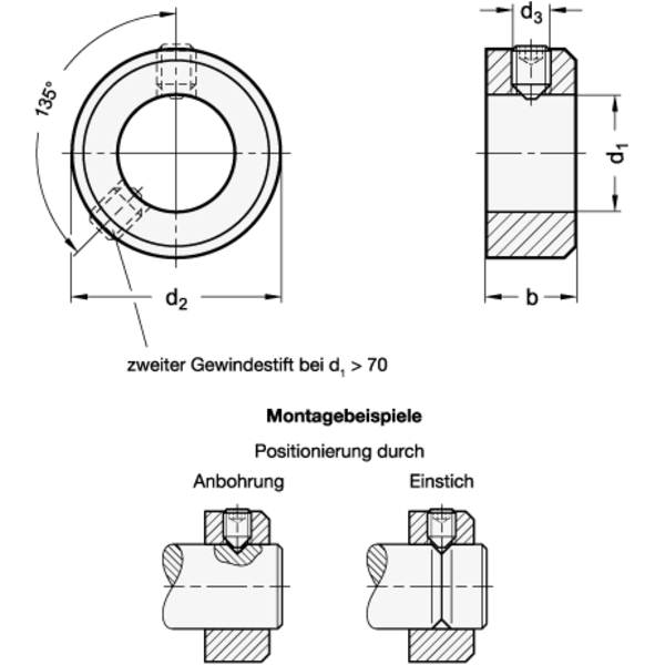 Die Klemmung erfolgt radial auf der Wellen- oder Achsenoberfläche. In Verbindung mit einer Anbohrung oder einem Einstich am Aufnahmedurchmesser lassen sich die Stellringe exakt positionieren und gleichzeitig werden dadurch Beschädigungen an der Klemmstelle vermieden.