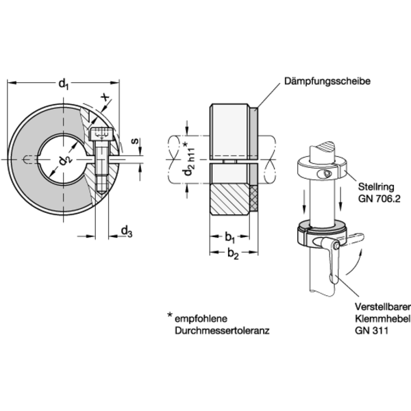 Die aufgeklebte Dämpfungsscheibe der geschlitzten Stellringe GN 7062.3 absorbiert leichte Stöße und wirkt geräuschmindernd beim Kontakt der Stellringe mit anderen Bauteilen.