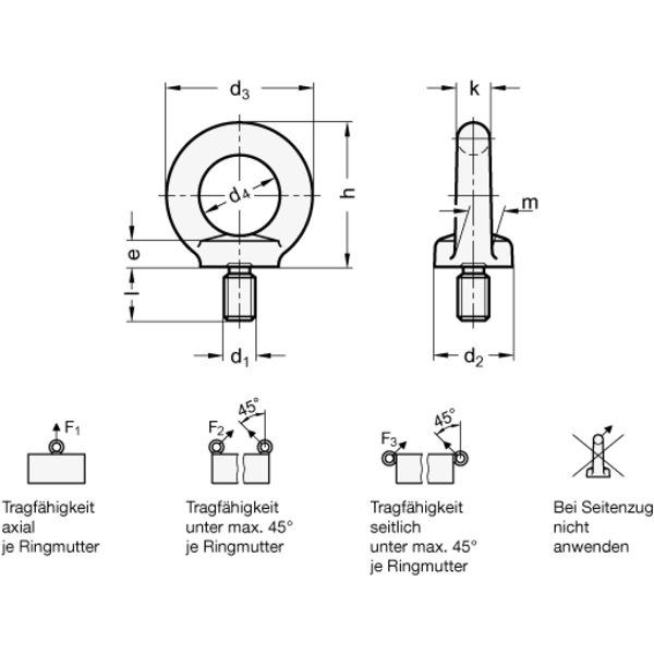 Folgende Anwendungsrichtlinien für Ringschrauben DIN 580 sind, auch im Hinblick auf die in der Tabelle aufgeführten Belastbarkeitsangaben, zu beachten: