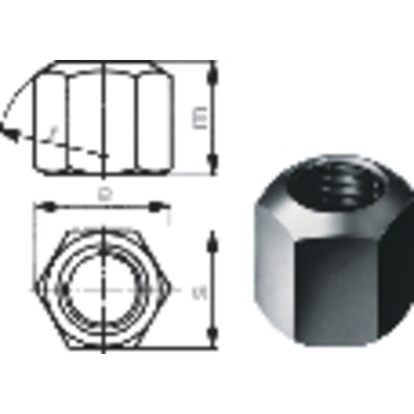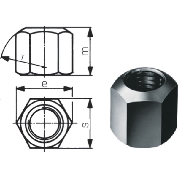 - hohe Mutter mit kugeligem Ende zur Verwendung mit Kegelpfannen DIN 6319 D und flachem Ende für die Unterlegscheiben DIN 6340