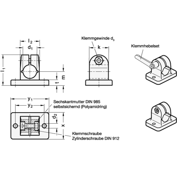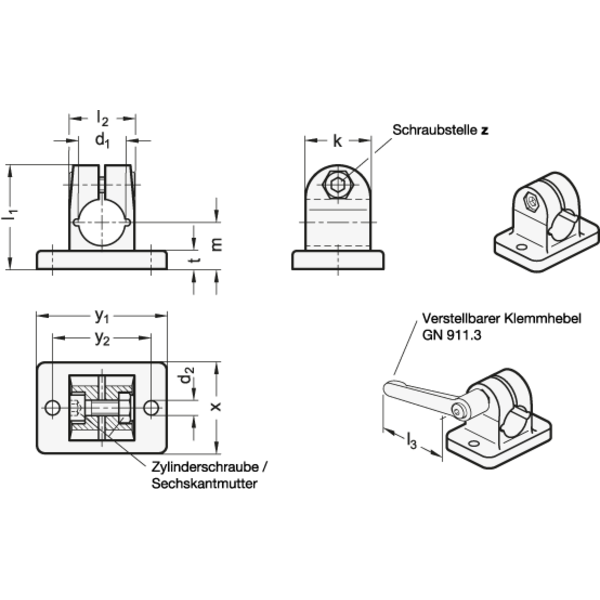 Wenn werkzeuglos geklemmt werden soll, kann die Zylinderschraube, durch einen in der Tabelle als Zubehör angegebenen verstellbaren Klemmhebel GN 911.3 ersetzt werden.