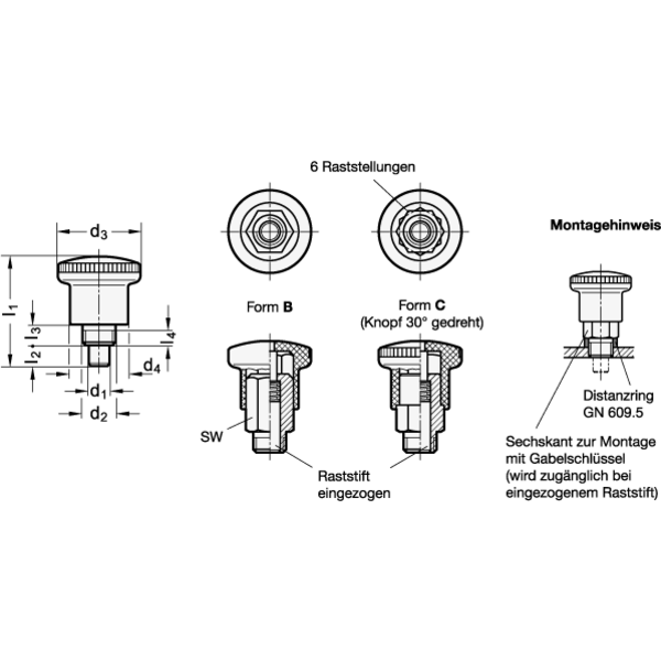 Bei der Form C kann der Knopf nach dem Einziehen des Raststiftes um 30° gedreht werden, wodurch er mittels Rastsperre in "eingezogener" Position gehalten wird.