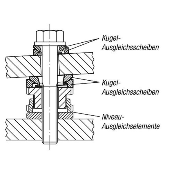 Die Kugel-Ausgleichsscheibe ermöglicht eine exakte Anlage bei der Montage von schrägen Auflageflächen bis zu einem Neigungswinkel von ca. 4°. Bei Schräglagen von D3 > 1° ist zur gleichmäßigen Auflage der Schrauben eine weitere Kugel-Ausgleichsscheibe als Unterlage zu empfehlen. Ober- und Unterteil können nicht auseinanderfallen, sie sind gesichert.