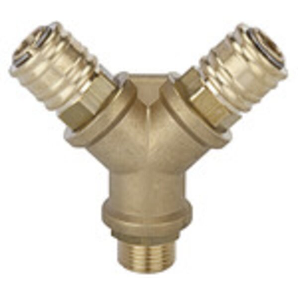 Verteiler mit 2 Schnellverschlusskupplungen NW 7,2, Messing blank, G 1/2 AG, Betriebsdruck 0 - 35 bar, Temp. -20 °C bis 100 °C. 1-, 2- bzw. 3-fach-Verteilerstücke aus Messing blank, fertig konfektioniert mit Schnellverschlusskupplung NW 7,2. Wahlweise mit Anschlussgewinde innen oder außen bzw. Stecknippel zum Adaptieren in eine bestehende Schnellverschlusskupplung NW 7,2 bis NW 7,8.
