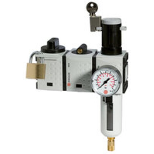 Wartungsstation SAFETY »FUTURA«, Kugelhahn-Anfahrventil-Filterregler, HA, BG 4, G 3/4, PE 2,5 - 16 bar, Regelbereich 2,5 - 8 bar. Diese Druckluft-Wartungsstation, bestehend aus einem Kugelhahn inklusive Schalldämpfer, einem Anfahrventil und wahlweise einem Druckregler, einem Filterregler oder einer Wartungseinheit erfüllt sämtliche Anforderungen an Betriebssicherheit und Unfallschutz!