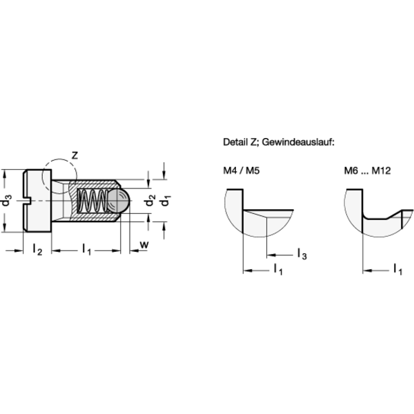 Federnde Druckstücke mit Kugel, mit Bund, mit Schlitz, Stahl