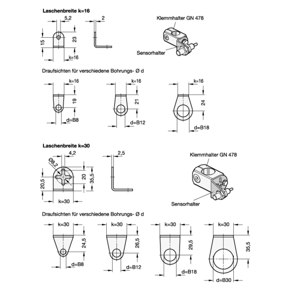 Die Befestigungsbohrung ist auf die Zentralgewinde von Anbau-Klemmhaltern GN 478 und Anbau-Laschen-Klemmhaltern GN 484 abgestimmt. Bei k=30 erlauben die kreuzförmig angeordneten Langlöcher eine zusätzliche Justierbarkeit und die Verwendung von zwei Befestigungsschrauben (gehören nicht zu Lieferumfang).