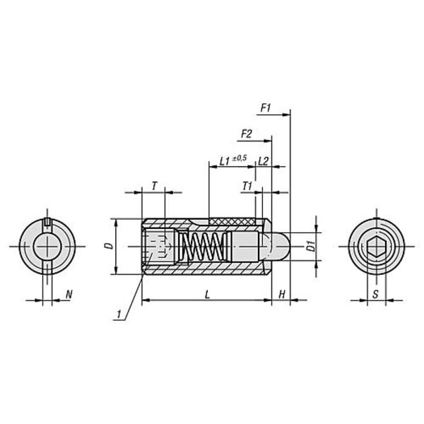 FEDERNDES DRUCKSTÜCK VERSTÄRKTE FEDERKRAFT, MIT GEWINDESICHERUNG D=M08 L=22, EDELSTAHL, KOMP:BOLZEN AUS