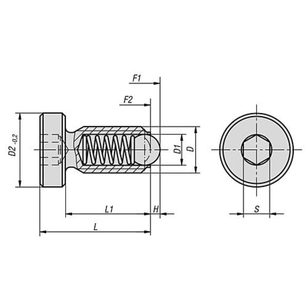 FEDERNDES DRUCKSTÜCK STANDARD FEDERKRAFT, MIT KOPF, D=M10 L=26, EDELSTAHL, KOMP:KUGEL AUS EDELSTAHL