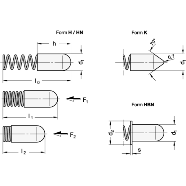 Bei der Form HBN wird durch den Bund das Herausspringen der Federhülse nach vorne verhindert. Zur Aufnahme genügt eine einfache Stufenbohrung. Die Sicherung erfolgt dabei von der Rückseite, z.B. durch eine Platte oder einen Gewindestift.