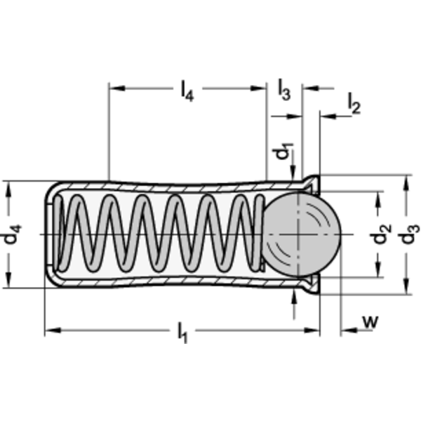 Federnde Edelstahl-Druckstücke zum Einpressen, lange Ausführung, mit Kugel