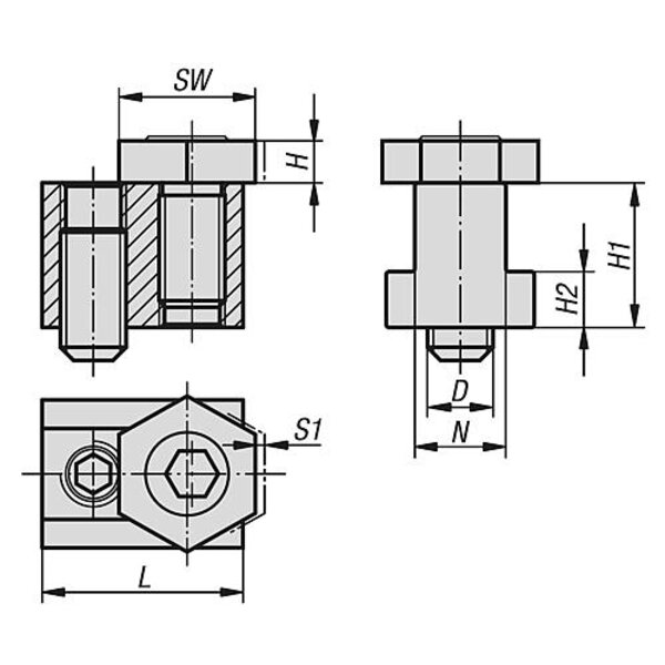 Die Spann-Exzenterschrauben mit Sechskant und T-Nutmutter können direkt auf dem Maschinentisch oder in T-Nut Platten eingesetzt werden. Mit dem durchgehenden Gewindestift wird das Element in der T-Nut abgestützt. Um Abdrücke auf dem Grund der T-Nut zu vermeiden, empfiehlt es sich dünne Unterlagen zu verwenden.