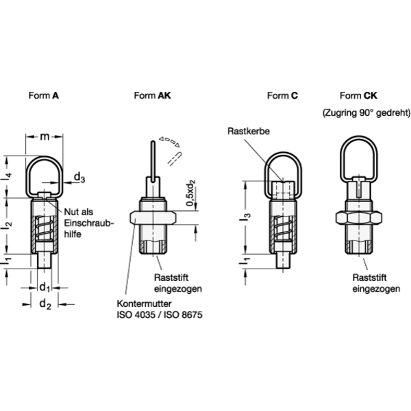 Der Zugring der Rastbolzen GN 413 kann durch seine Form, sowohl als Einschraubhilfe bei der Montage verwendet werden, als auch als Rastsperre (Form C / Form CK) dienen.
