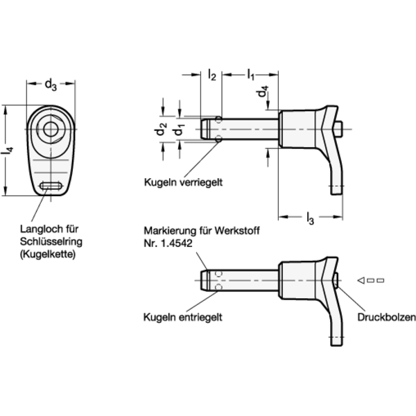 Kugelsperrbolzen, Bolzen Edelstahl 1.4542, L-Griff Kunststoff