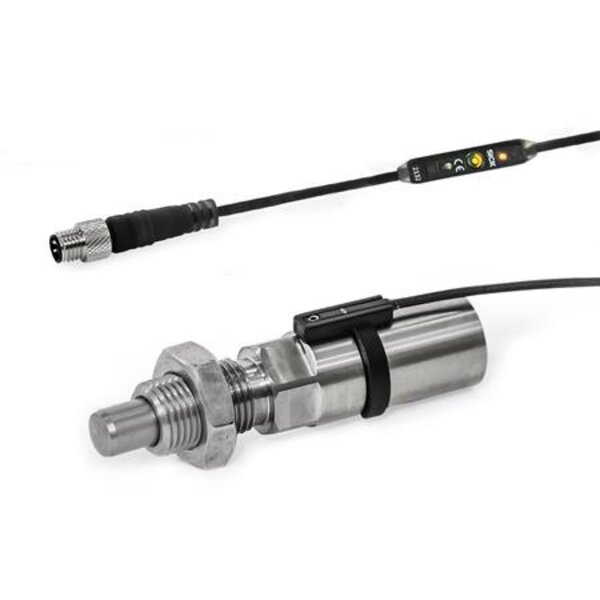 Die Raststiftposition kann über einen integrierten Magnet elektronisch mittels Sensor abgefragt werden. Die Endlagen (Ein- und Ausrastposition) werden über das Bedienelement am Sensorkabel eingelernt. Sie liefern jeweils ein High-Signal, welches an der jeweiligen LED angezeigt wird und z. B. durch eine Maschinensteuerung verarbeitet werden kann.