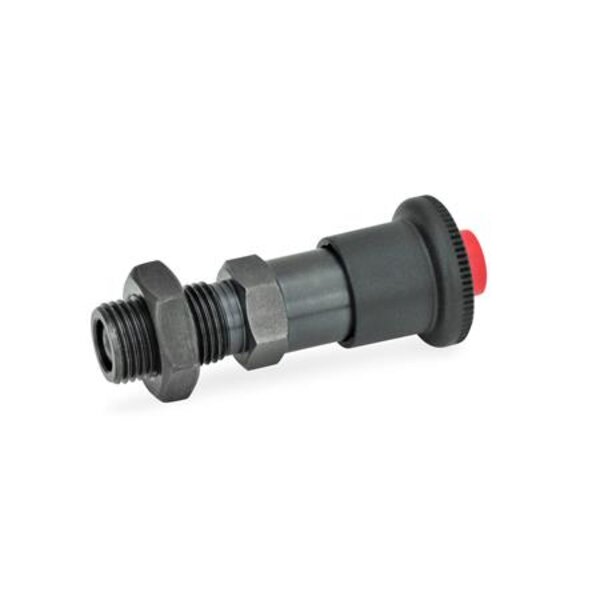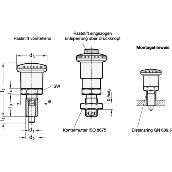 Rastbolzen GN 414.1 mit Klick-Rastsperre werden eingesetzt, wenn der Raststift zeitweise nicht vorstehen soll. Hierzu wird der Knopf beim Einziehen des Stiftes auf seine Endposition durch ein deutlich hörbares „Klick“ eingerastet.