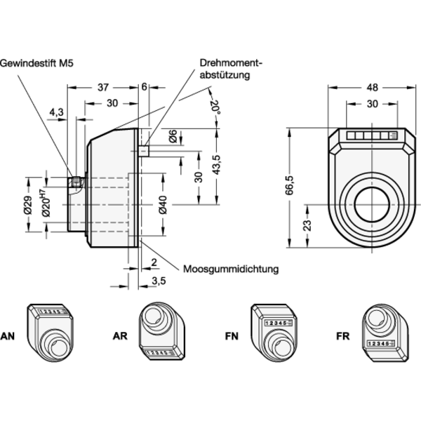 Stellungsanzeiger, 5-stellig, digitale Anzeige, mechanisches Zählwerk, Hohlwelle Edelstahl