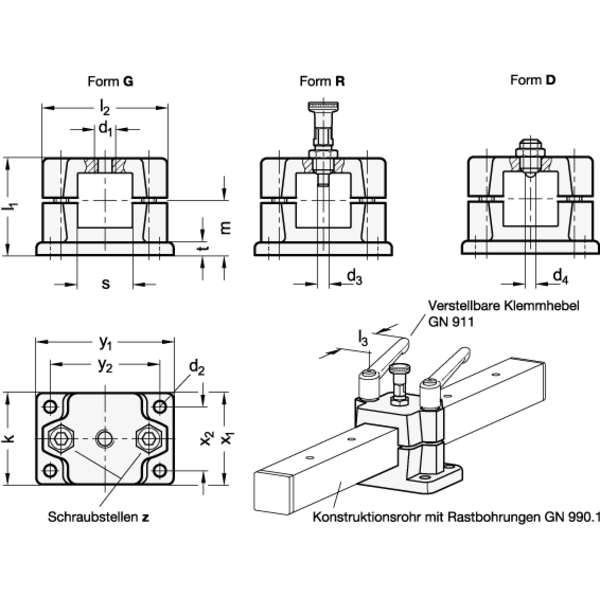 Wenn die Klemmung schnell und werkzeuglos erfolgen soll, ersetzen die in der Tabelle als Zubehör angegebenen Klemmhebel GN 911 die Zylinderschrauben der Schraubstellen z. Zentrierbuchsen an den Schraubstellen eliminieren das axiale Spiel zwischen den Unter- und Oberteilen der Rastschlitten.