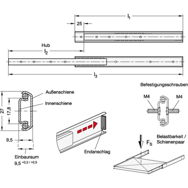 Teleskopschienen GN 1400 werden vertikal und paarweise verbaut. Der Hub erreicht ˜ 75 % der Nennlänge l1 (Teilauszug). Bei der Form A ohne Stoppgummi sind die Endanschläge aus Stahl, wodurch ein unbeabsichtigtes Ausziehen bzw. Trennen der Schiene verhindert wird. Treten in Auszugsrichtung größere statische oder dynamische Belastungen auf, sollten diese durch externe Anschlagelemente aufgenommen werden.