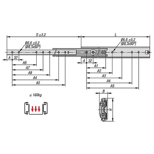TELESKOPSCHIENE L=500 19,1X53,1, ÜBERAUSZUG S=523,5, Fp1=160, Fp2=140, STAHL VERZINKT, MONTAGE SEITLICH, 1