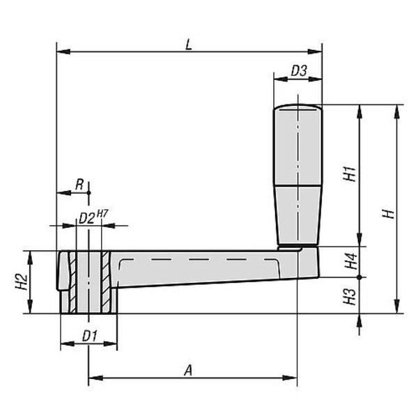 HANDKURBEL PASSBOHRUNG, D2=12, A=100, L=126,5, H=100, FORM:D MIT DREHBAREM GRIFF, ALUMINIUM SCHWARZ