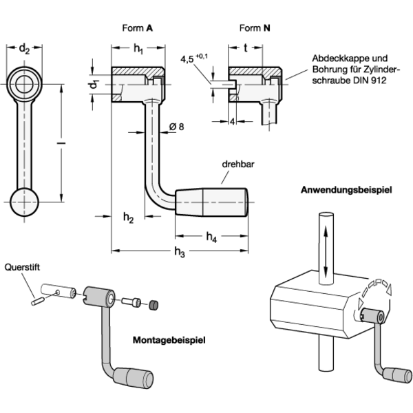 Die Quernut der Form N überträgt auf einfache Weise über einen wellenseitig montierten Querstift die Drehbewegung auf die Welle. Dabei kann die Kurbel abziehbar aufgesteckt sein oder durch eine Zylinderschraube DIN 912 axial dauerhaft befestigt werden. Die Form A kann mit Querbohrungen GN 110 bestellt werden.