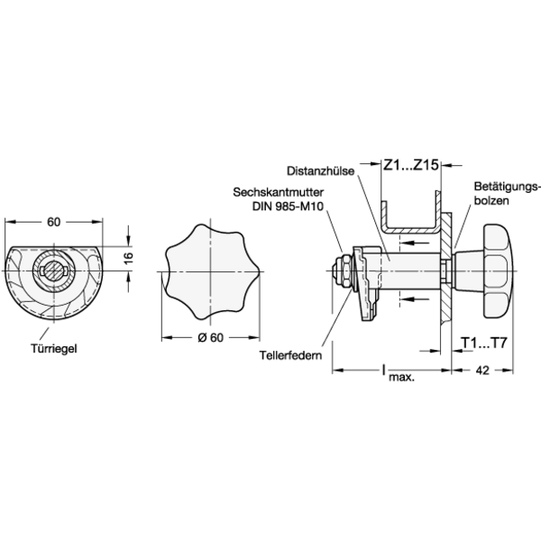 Durch verschieden abgestufte Betätigungsbolzen und Distanzhülsen lässt sich eine Türbreite T1...T7 von 1,5 bis 12 mm sowie eine Zargenbreite Z1...Z15 von 0 bis 51 mm abdecken.