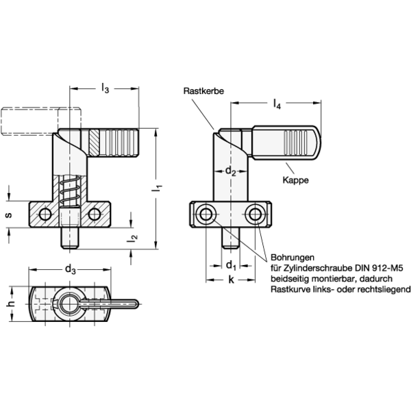 Rastriegel GN 612.2 werden eingesetzt, wenn der Raststift zeitweise nicht vorstehen soll. Durch Drehen des Riegels um 180° wird der Raststift eingezogen. Die Rastkerbe ermöglicht ein sicheres Positionieren.