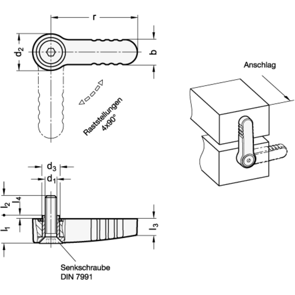 Die innenliegende Kugel-Feder-Rastmechanik verfügt über 4 Raststellungen im Abstand von je 90°. Dank der Befestigung mittels der Senkschraube kann die Rastposition beliebig gewählt werden.