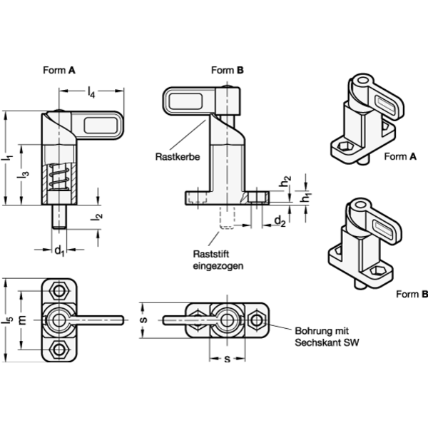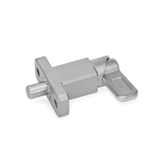 Bei Federriegeln GN 722.2 wird der Raststift über die Kurve der Führung durch eine 180°-Drehung des Riegels eingezogen. Die Rastkerbe am oberen Ende der Kurve bewirkt, dass der Riegel gehalten wird wenn der Raststift zeitweise nicht vorstehen soll. Die Edelstahl A4-Ausführung ist für den Einsatz in besonders aggressiven Umgebungen vorgesehen.
