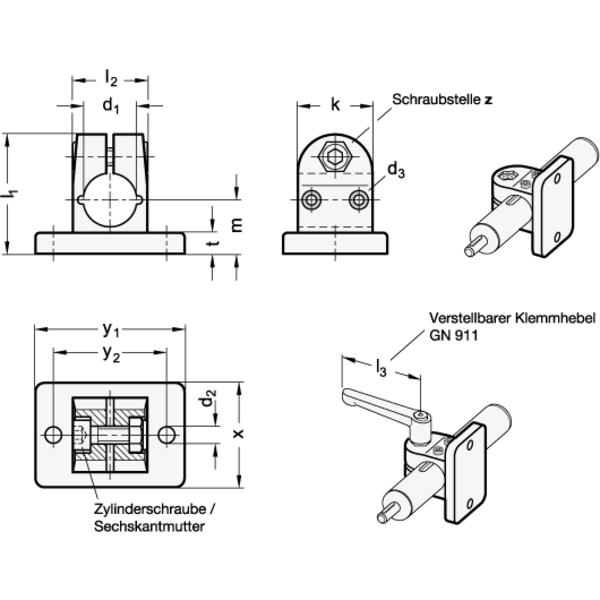 Wenn die Klemmung schnell und werkzeuglos erfolgen soll, kann die Zylinderschraube durch einen in der Tabelle als Zubehör angegebenen verstellbaren Klemmhebel GN 911 ersetzt werden.