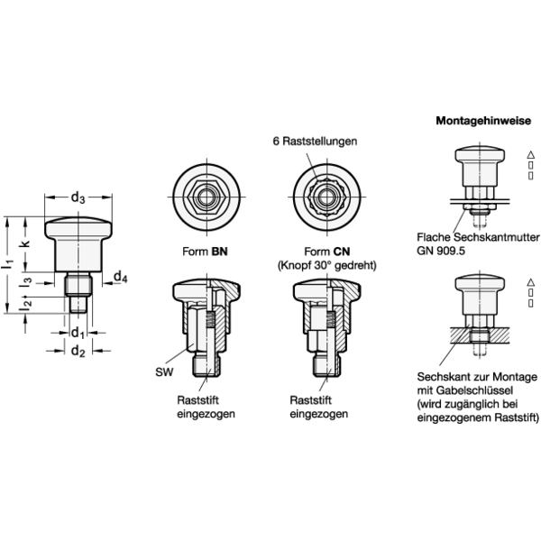 Basierend auf dem Prinzip der Miniraster GN 822 vereinen sie deren vorteilhafte Bauart mit einer lückenlosen Reihe aller gängigen Größen an Bolzen und Gewinden. Damit stellen sie eine preisgünstige Alternative zu den Rastbolzen GN 607 / GN 607.1 der entsprechenden Größen dar.
