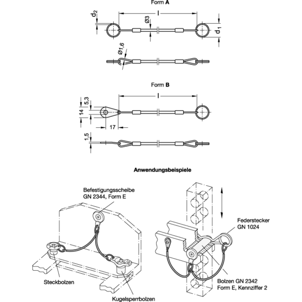 Halteseile GN 111.8 sind in 3 unterschiedlichen Formen erhältlich und können dadurch in einer Vielzahl von Anwendungen z.¿B. als Verliersicherung sowie Verbindungs- und Befestigungsseile eingesetzt werden.