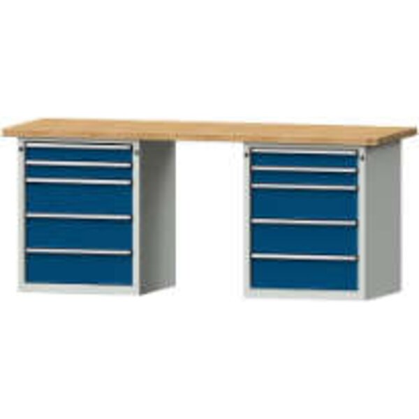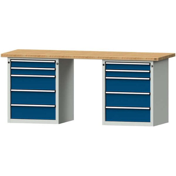 -Kombiwerkbank (Serie V) mit 2 x Schubladenunterschränke stehend, mit 10 Schubladen (4x90, 6x180 mm), lichtgrau/enzianblau Die Kombiwerkbänke der Serie V haben eine Gesamttraglast von 1000 kg mit bodenstehendem Sockelschrank.