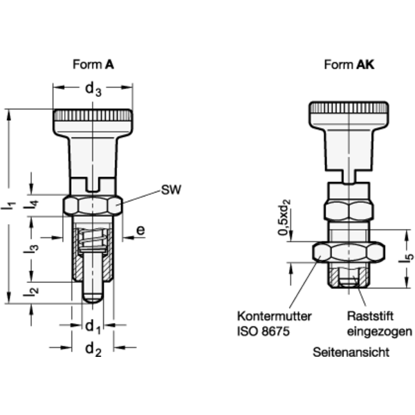Rastbolzen GN 617.1 mit Rastsperre werden eingesetzt, wenn der Raststift zeitweise nicht vorstehen darf. Hierzu wird der Knopf nach dem Herausziehen um 90° gedreht. Durch eine Rastkerbe wird der Knopf in dieser Position gehalten.