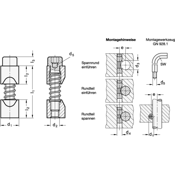 Das Gewinde d5 dient zur Aufnahme des Montagewerkzeuges oder einer Schraube, womit das Klemmelement bei der Montage axial gehalten werden kann.