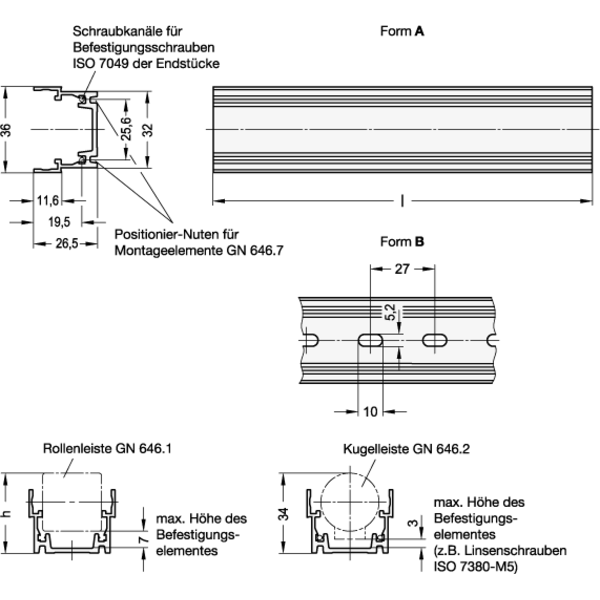Trägerprofile GN 646.3 bilden die Grundkörper für Rollen- und Kugelleisten. Sie sind Träger für die Rollenleisten GN 646.1 und die Kugelleisten GN 646.2 und zeichnen sich durch eine hohe Steifigkeit aus.