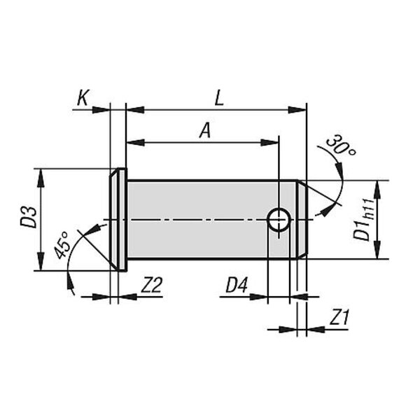 Bolzen mit Splintloch, passend zu Gabelköpfen DIN 71752. Die Sicherung erfolgt durch Splinte.