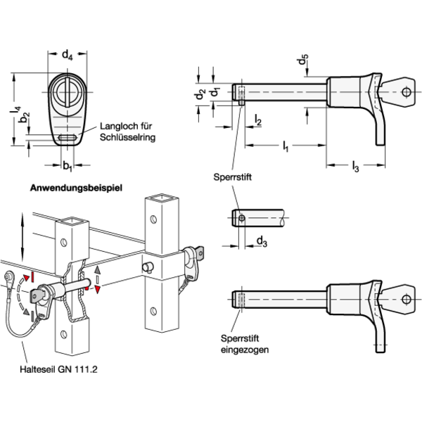 Abschließbare Steckbolzen GN 314 mit L-Griff werden zum schnellen, werkzeuglosen Fixieren, Verbinden und Sichern verschiedener Bauelemente eingesetzt. Eine 180°-Schlüsseldrehung bewegt den Sperrstift am vorderen Bolzenende, der so für die axiale Sicherung des eingesteckten Bolzens sorgt. Ein unautorisiertes Entfernen ist nach dem Abschließen nicht mehr möglich. Der Schlüssel lässt sich in beiden Endstellungen abziehen.