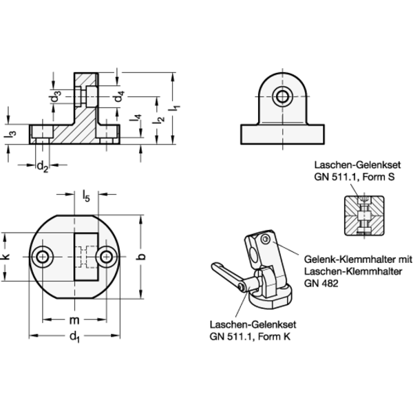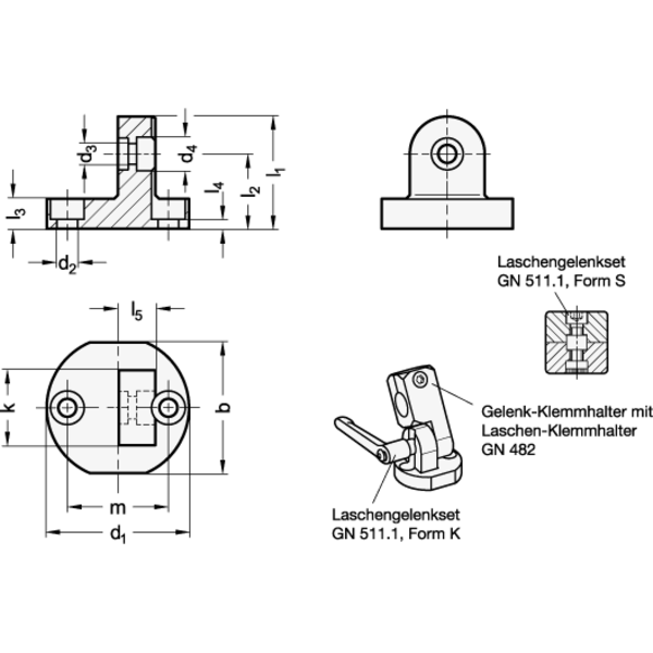 Fußlaschen-Klemmhalter GN 485 lassen sich mit Laschen-Klemmhalter GN 482, T-Laschen-Klemmhalter GN 483 sowie mit Anbau-Laschen-Klemmhalter GN 484 mit gleichen k-Maßen zu Gelenk-Klemmhaltern kombinieren. Dazu stehen Laschengelenksets GN 511.1 mit Schraube (Form S) und mit verstellbarem Klemmhebel (Form K) zur Verfügung. Die Bestellbezeichnung ist jeweils der Maßtabelle zu entnehmen.